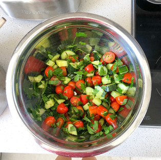 Step 5. While the couscous is cooking, prep the veg: chop the cucumber, halve the cherry tomatoes, chop the parsley and toss together in a bowl